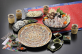 希少価値のある天然国産のとらふぐを使用し、熟練の職人の手によって一切れずつ丁寧に盛り付けられたふく刺身は、陶器絵皿に盛り付けられた目で、舌で楽しめる芸術的な逸品。職人の手による芸術的な「刺身」は歯ごたえの良い古式引き。「皮」と一緒にお召上がりください。心と体も温まり、人々を魅了する「ちり鍋」や「ひれ酒」、最高級とらふくの真髄をご堪能頂ける天然とらふくのフルコースです。