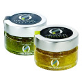 エキストラ・バージン・オリーブオイルオロバイレンをゼラチンで作った膜で包み込み宝石のように美しい球状の形をしたオロバイレンパール。お口の中でオリーブオイルの味と香りが広がります。濃い色のグリーンがピクアル種、明るい若葉色のグリーンがアルベキーナ種です。